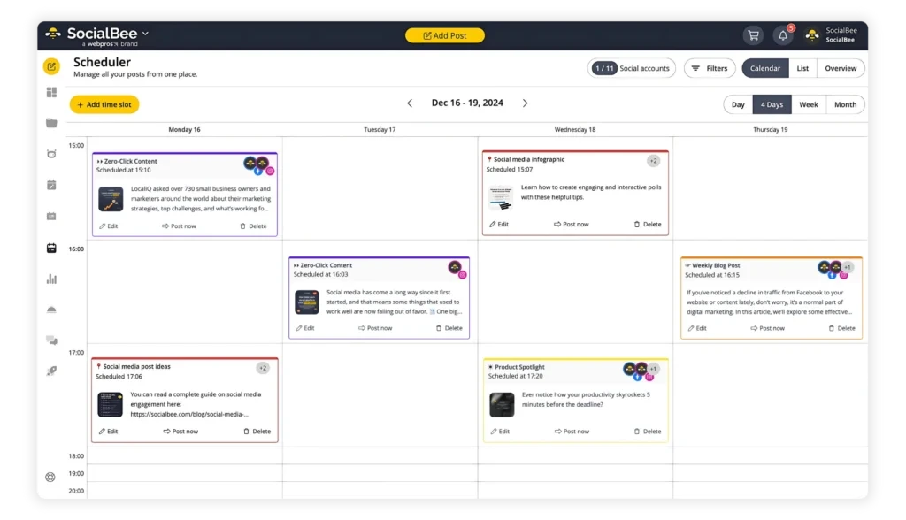 If you’re juggling multiple client accounts, social media tools like SocialBee, Buffer, and Sendible make life a lot easier. They let you manage all your clients in one place, create separate workspaces, and even tailor content for different platforms.